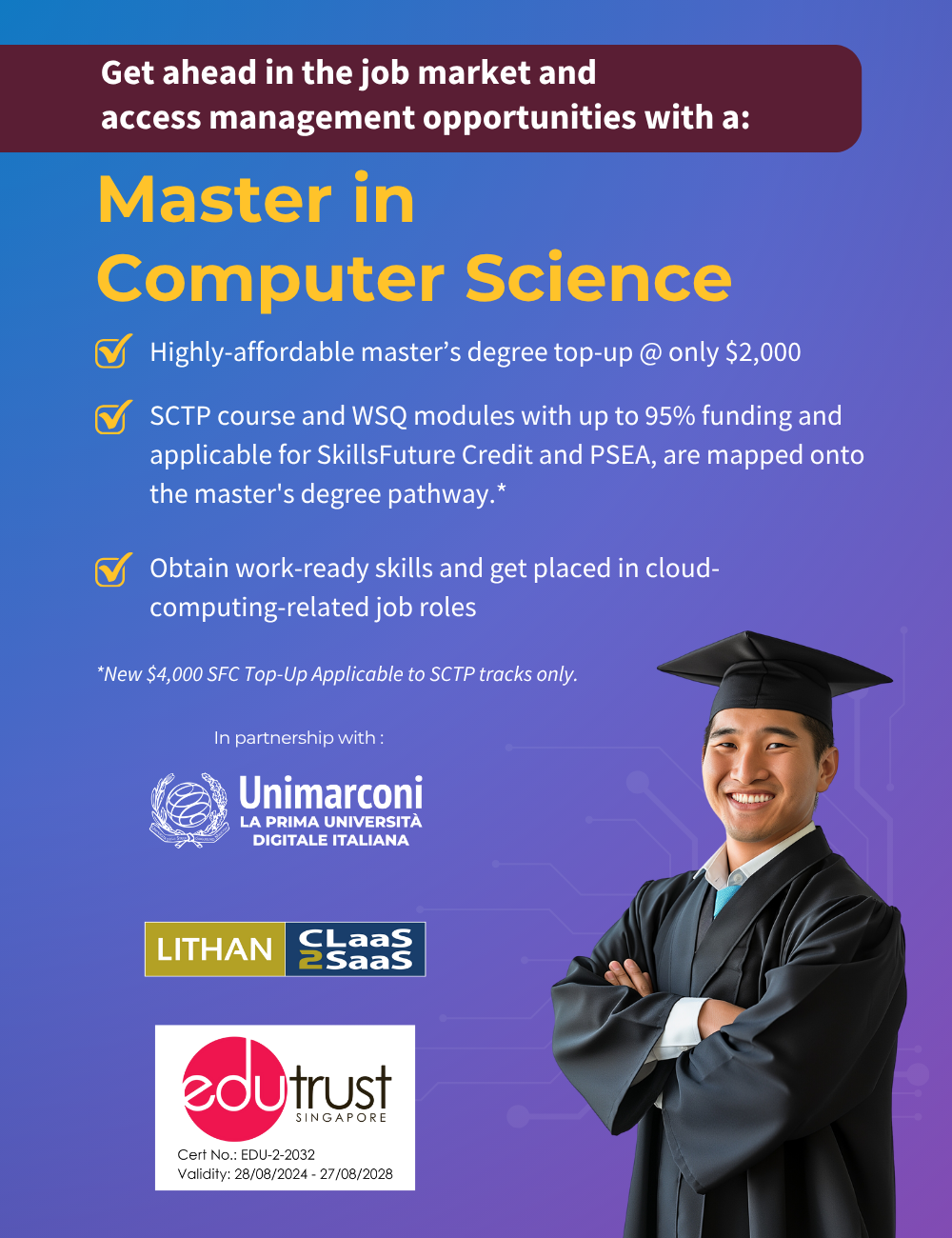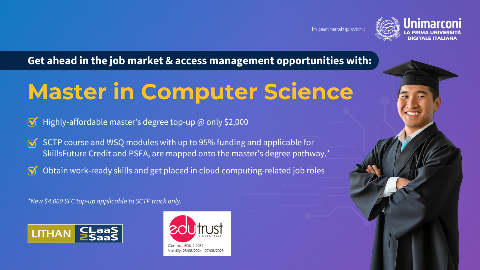 This is a 14-month master’s degree pathway. You will first go through a cloud computing SCTP track consisting of 6 modules, funded up to 95% by SkillsFuture Singapore and receive a (SCTP) WSQ Advanced Certificate in Infocomm Technology (Infrastructure) (Synchronous and Asynchronous E-Learning). You will then need to complete 2 non-SCTP modules, WSQ Programming Foundations and WSQ Develop Enterprise Applications. All these will lead to 2 top-up modules required to obtain your Master in Computer Science awarded by Guglielmo Marconi University, Italy.