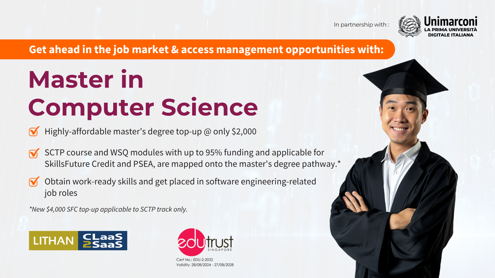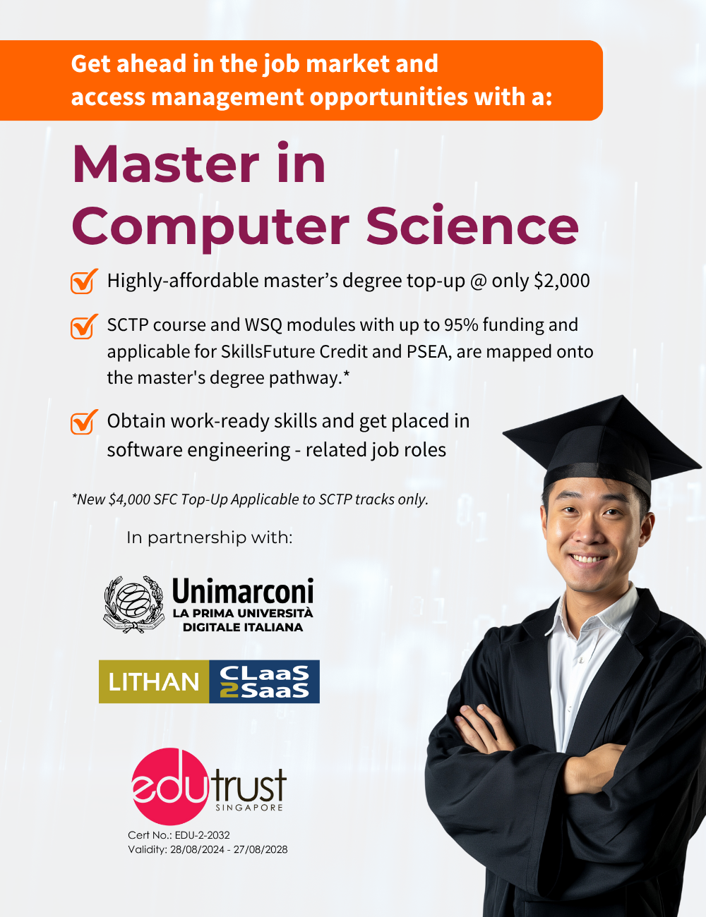 We have mapped our SCTP course and WSQ modules to the master's degree pathway. You will receive up to 95% funding for the SCTP course, and any unfunded fees can be offset by SkillsFuture Credit or PSEA to minimise any cash payment needed.
