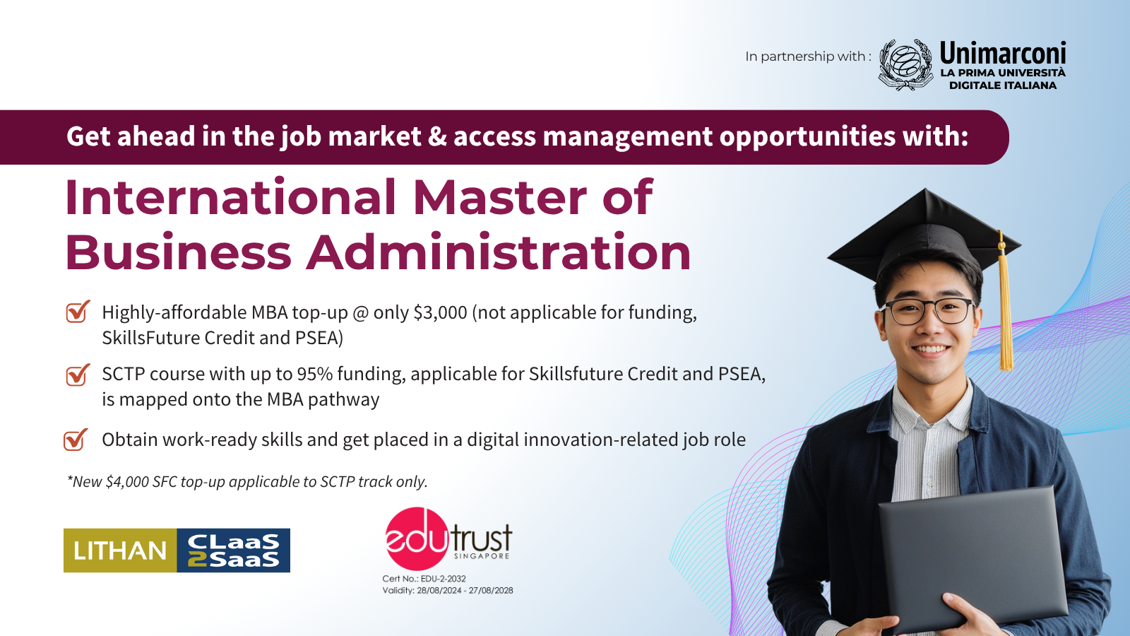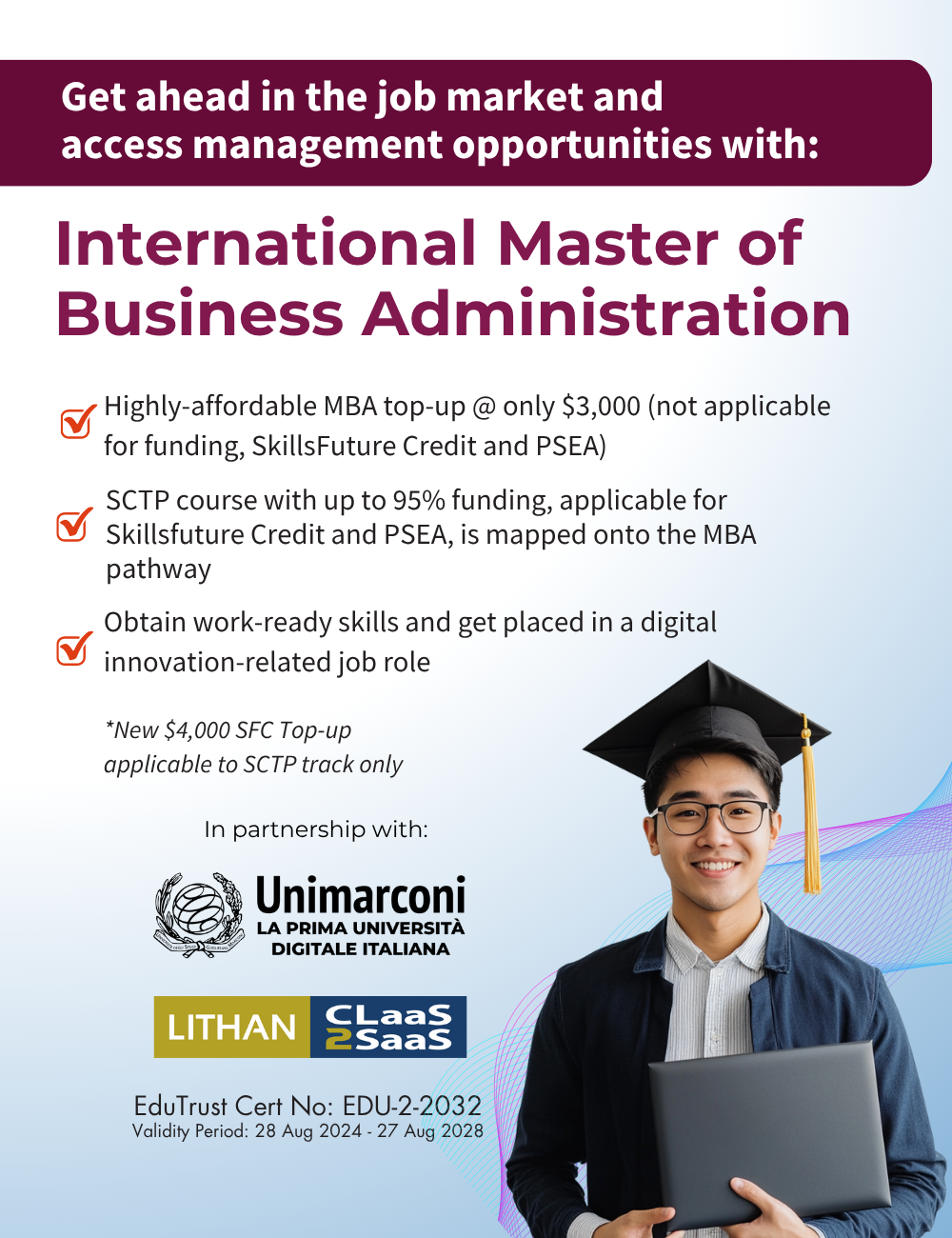We have mapped our SCTP course and WSQ modules to the master's degree pathway. You will receive up to 95% funding for the SCTP course, and any unfunded fees can be offset by SkillsFuture Credit or PSEA to minimise any cash payment needed.